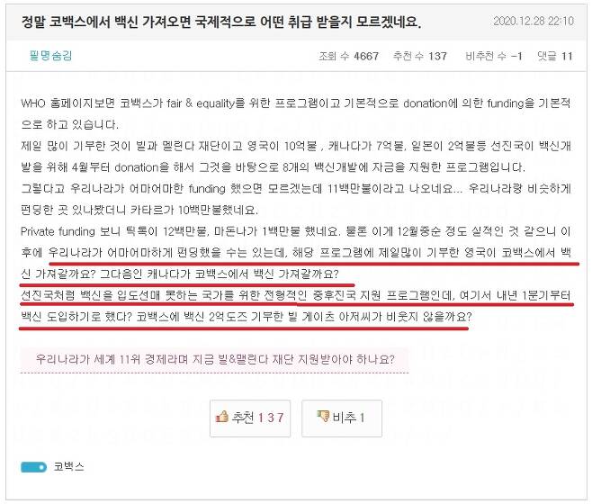 글에 달린 댓글을 보면 "가난한 개도국 백신을 털어먹으면 좋냐. 지원해주지는 못할망정 나라 망신", "우리나라가 코백스 물량을 가져오는 건 벤츠 타고 무료 급식소 가서 급식 먹겠다는 소리", "도네이션(기부)한 것도 없는데 뭘 가져오겠다는 건지…."와 같이 동조하는 댓글이 잇따랐으며, 추천 수도 140건에 이르렀습니다.